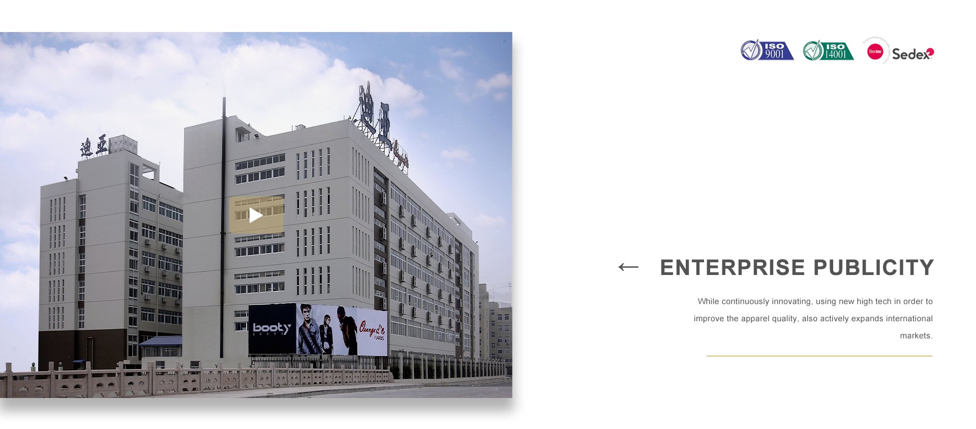 浙江迪亞服飾有限公司于1998年在世界時尚品牌之都——法國巴黎二區應運而生。同年,在浙江省甌海經濟開發(fā)區東方南路28號設立服裝制造工廠。公司集服裝設計、生產、營銷、品牌于一體,在不斷創新、采用高新技術提高服飾質量的同時,積極拓展國際市場,海外營銷部長期與LV集團旗下的MAJE、SOEUR、BALIBARIS等國際著名品牌保持非常緊密的合作關系。品牌建設是公司堅持不懈的追求,我們每年都會積極參加國內外舉辦的各大服裝展銷會。憑借著良好的質量與信譽,市場占有率在逐漸擴大,產品遠銷歐洲、美洲、亞洲等國。公司以生產棉衣、羽絨服、派克、大衣、夾克、運動休閑服飾等為主,旗下主打品牌有 ORANGE D’OR 、CLAIRVAL、BOOTY JEANS 、S&V和SASAEC,各品牌服飾均以典雅的色彩、優(yōu)美的線條、卓越的魅力吸引著都市麗人,將時尚、經典的潮流信息予以淋漓盡致的演繹。